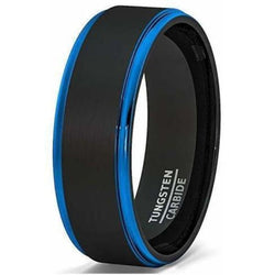 - Men's Two Tone Brushed Black Tungsten Ring With Blue Stepped Edges - 8mm