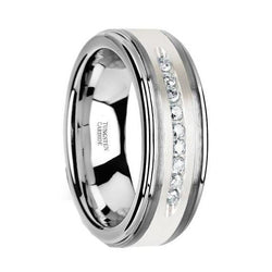 - Men's Tungsten Wedding Band with Brushed Silver Inlay and 9 White Diamonds - 8mm