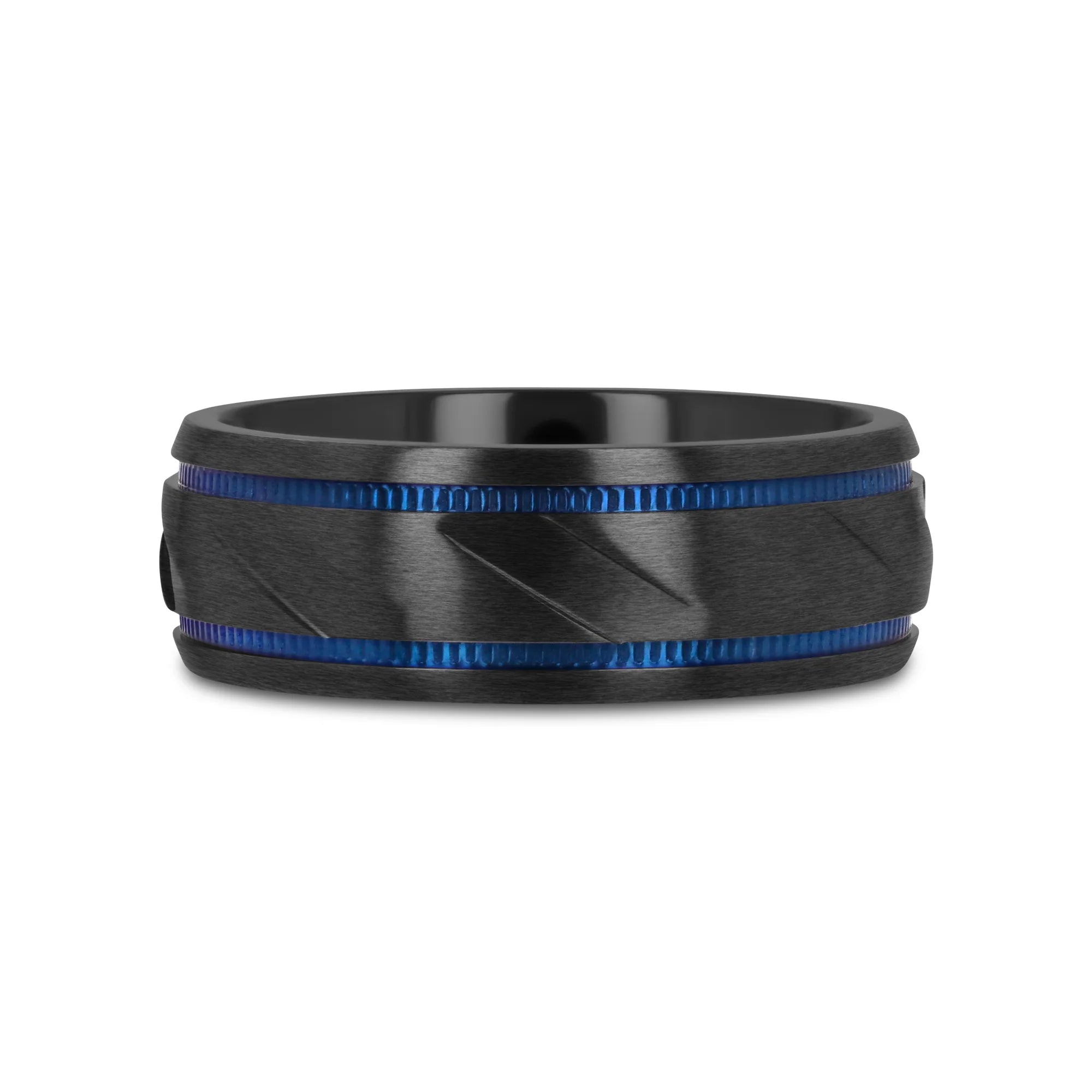 ZION Black Titanium Diagonal Pattern Wedding Ring Blue Milgrain Grooves – 8mm