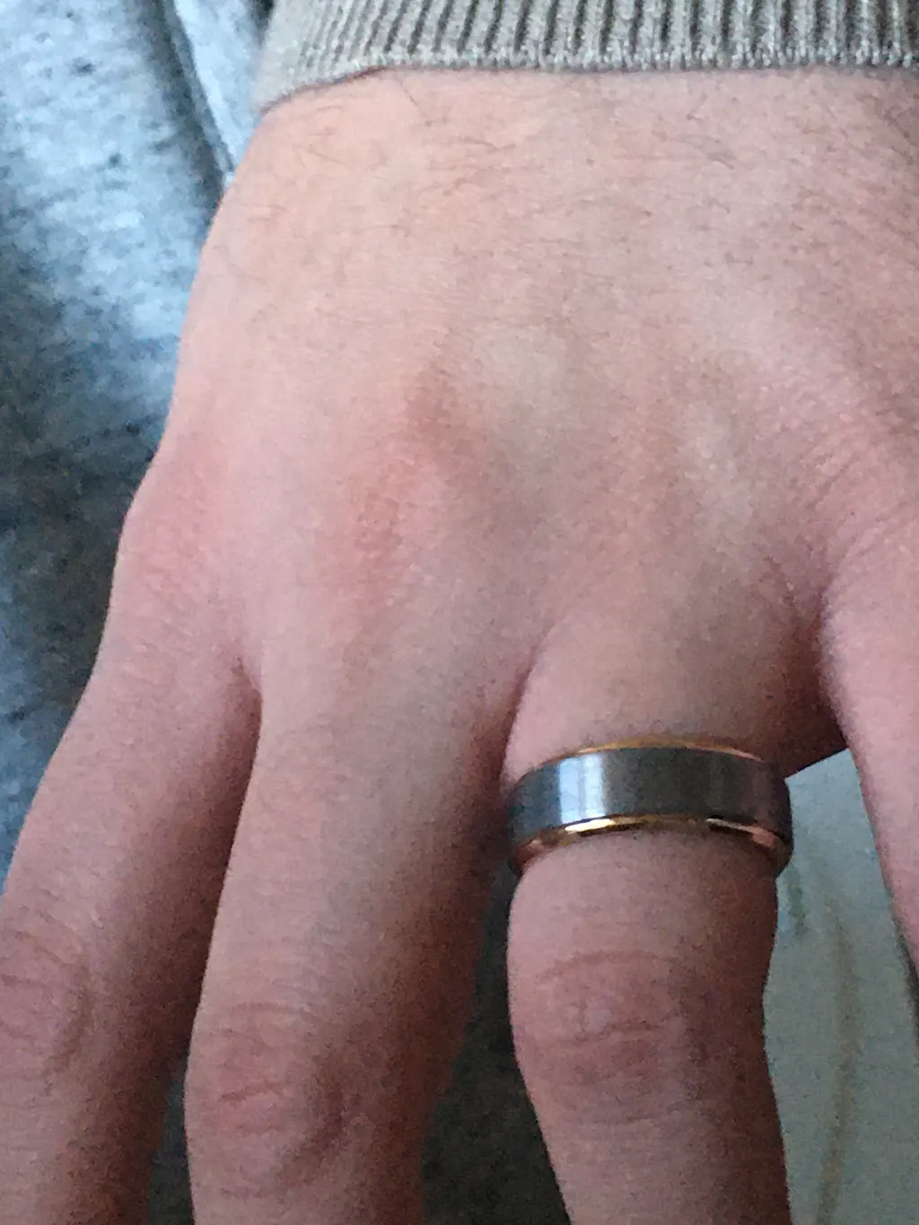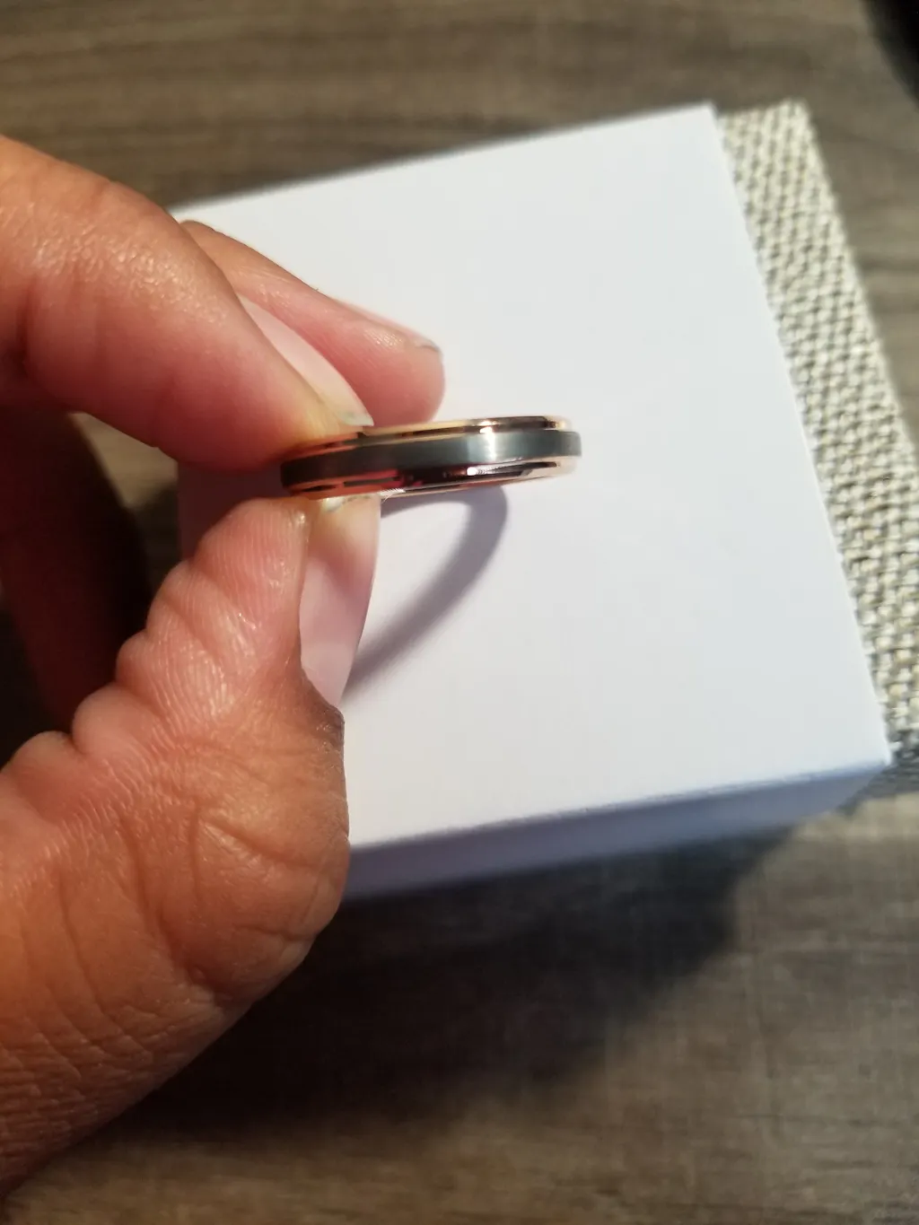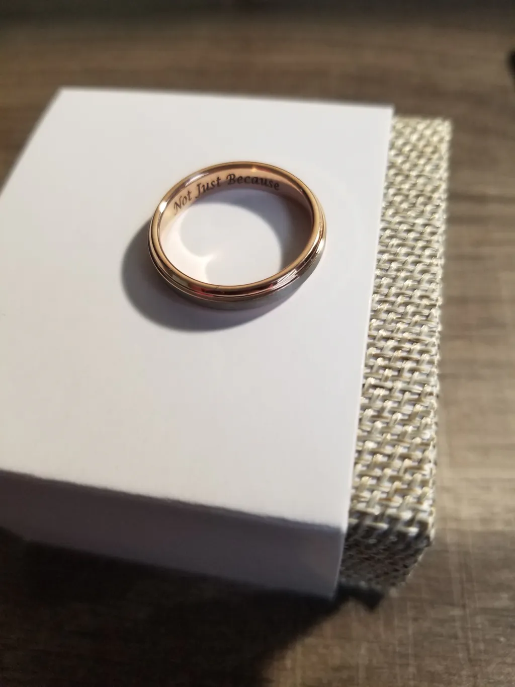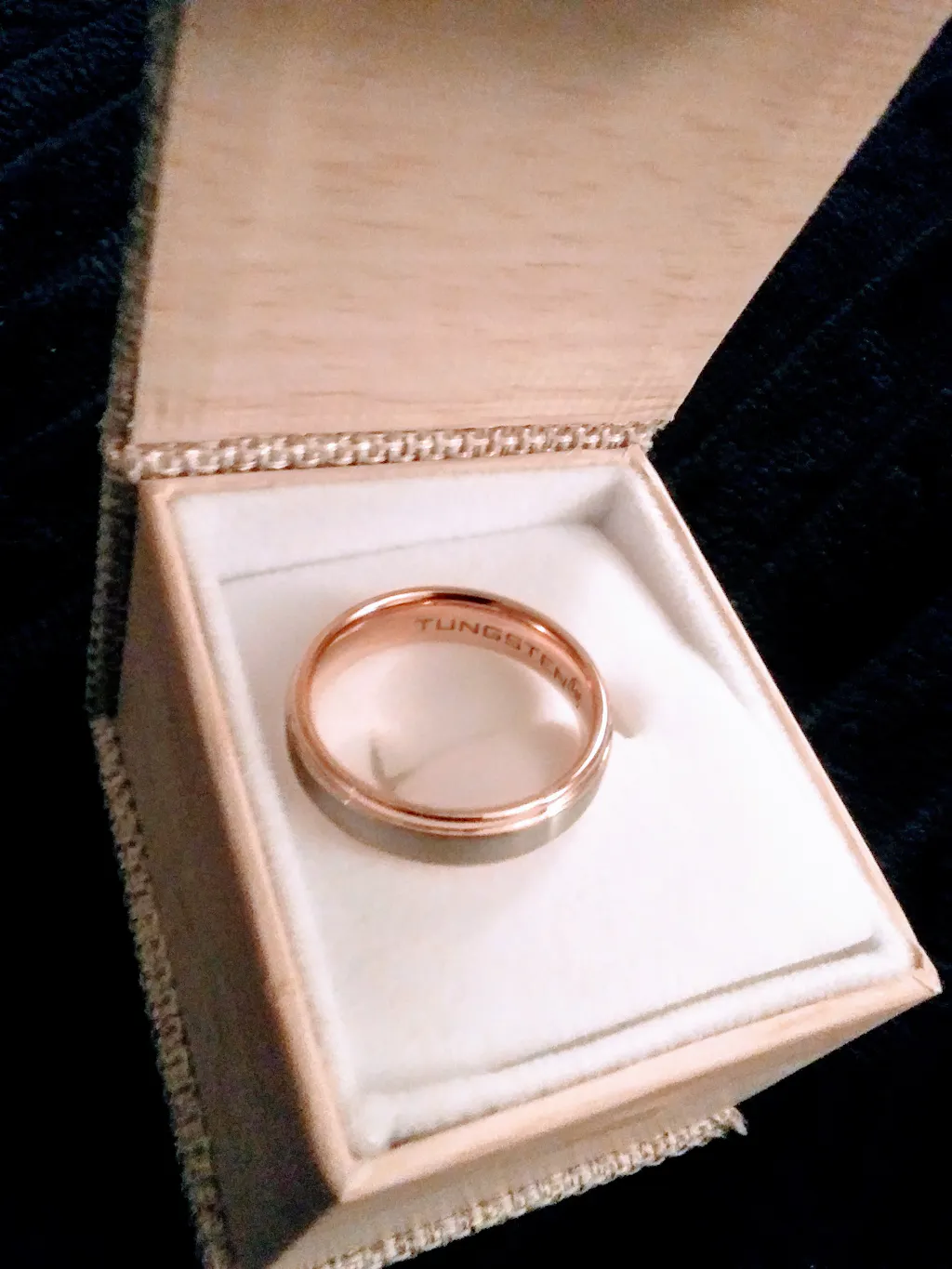 Tough and long lasting, this tungsten carbide ring is stronger than titanium and almost indestructible. Although tungsten carbide is scratch resistant, the rose gold treatment may be more delicate. A joy to wear, the ring comes with a comfort fit, a smooth interior, and beveled edges.
